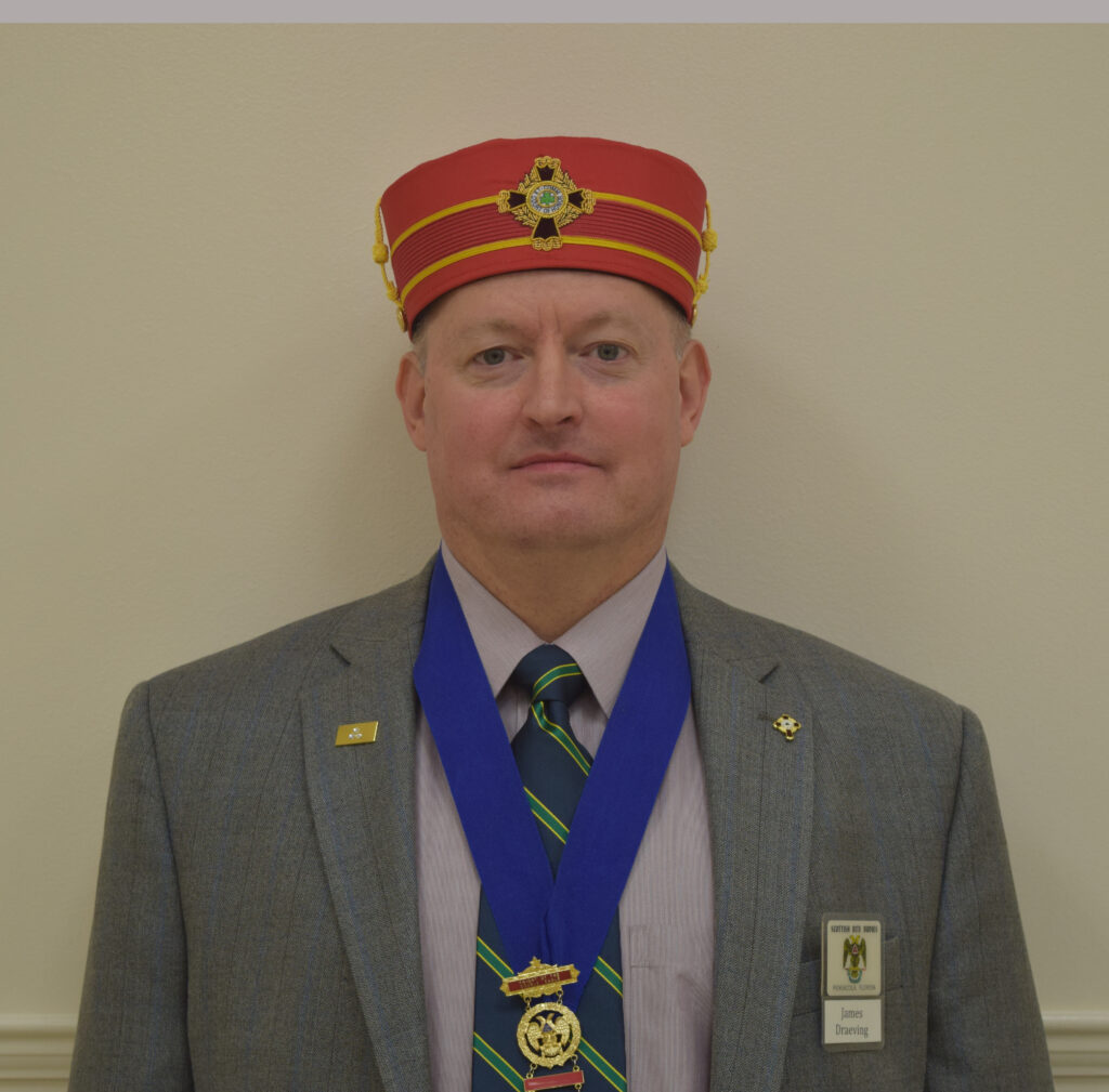 32°- Master of the Royal Secret The lessons taught in this degree are that genuine brotherhood requires mutual regard, opinion, esteem and charity. We always look for the good in all and make allowances for others’ shortcomings. We trust the Supreme Architect to lead us to friendship, morality and brotherly love. The apron worn in this degree is white, lined in black, with a double-headed eagle and a plan of the Camp of the Princes. The jewel worn is a golden Teutonic Cross. In the center are the letters XXXII, surrounded by a green wreath. The cap of a Master of the Royal Secret is black silk with a black band trimmed in gold. In the center front is a double-headed eagle emblem with a rayed equilateral triangle above in gold. The triangle is red, has 32° in its center, and is trimmed with gold.